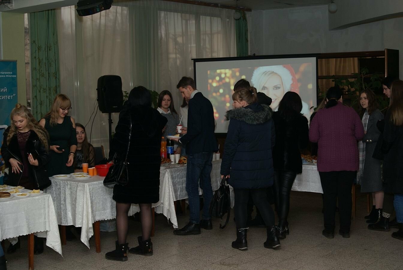 Розпочались новорічні дійства Святковим благочинним студентським ярмарком. Започаткований за ініціативи колективу науково-педагогічних працівників університету, зокрема проректором з виховної, профорієнтаційної роботи та зовнішніх зв’язків Поляковою Світланою Василівною, який вже став традиційним. Студенти усіх факультетів підготували для присутніх та гостей свята театралізоване дійство та продемонстрували свої кулінарні таланти. Це було справжнє Королівство смаку та розваг! Приємним сюрпризом для всіх стала й новорічна шоу-вистава «Майже Попелюшка». Яскраві персонажі, веселі танці і чудова атмосфера подарували всім присутнім незабутні емоції та приємні враження.